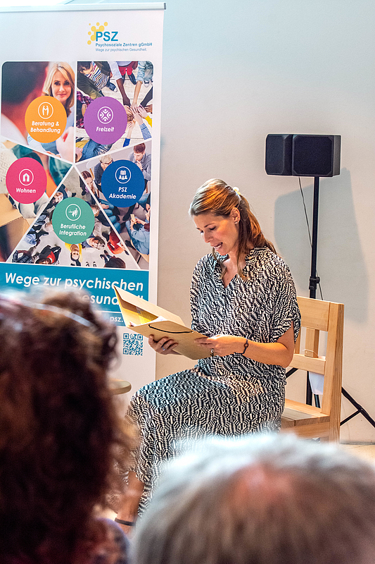 Ein besonderes Highlight war die Lesung der renommierten Schauspielerin Catherine Oborny. Sie verlieh den Geschichten und Lebenserfahrungen der Klient*innen der PSZ eine eindrucksvolle Stimme und sorgte für eine berührende Atmosphäre.